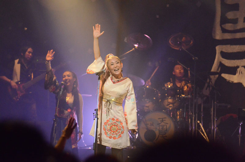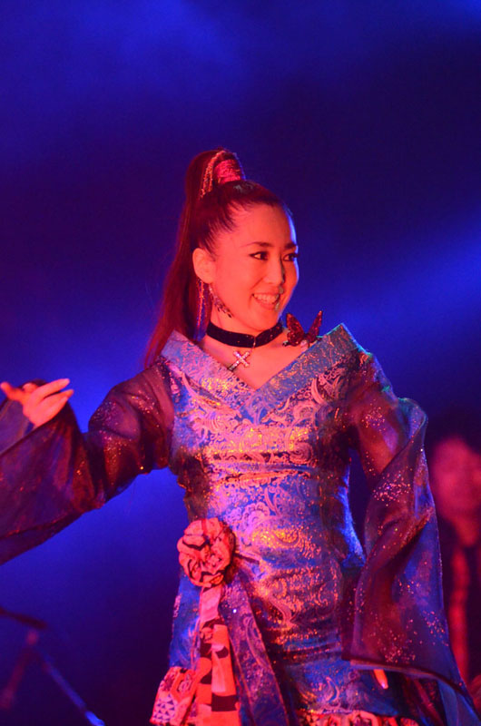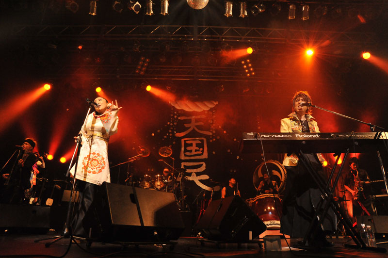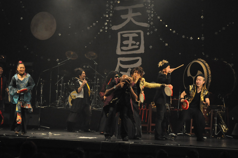 After their performance, Kumiko appeared, veiled in a white robe carrying a lantern. With only a bell resounding tranquilly, the light was ceremonially extinguished. This scene was produced and designed by Kaori Turner, being dedicated to the souls of the dead from the March 11 catastrophe. This ceremony for the departed souls was performed at every venue during the L.A tour. In the midst of darkness after the light went off, Heavenese appeared on the stage.