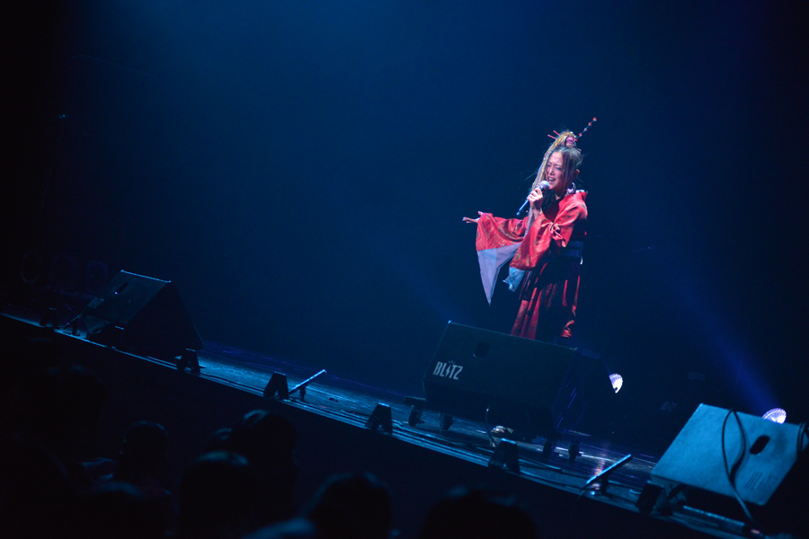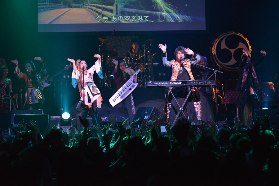 This is a song about the strength and beauty of a Japanese woman who played an active role at the end of the Edo Era. While Marre was talking, all the female band members appeared on stage in new costumes. Without the dance unit"Araifumi", this performance of the song would not be what it is. The choreographer and leader of this dance group, HIDETOMO, has been striving for excellence in expressing the beauty of Japanese people through the combination of Japanese and Western style dance. Their partnership with HIDETOMO is indeed an indispensable addition to their performance.